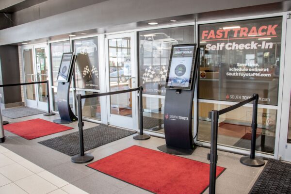 <!-- wp:reyrey-js/paragraph {"content":"Even though you may have communicated your new options digitally, it’s also important to advertise the check-in process in-store. It’s a good idea to have some displays showcasing your kiosk. Having an enticing sign highlighting clear benefits of using them allows customers to see the potential on their own. Take South Toyota for example. Their window signage clearly states what self-check-in means and how the customer can save even more time."} /-->