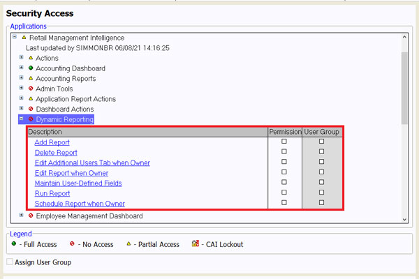 <!-- wp:reyrey-js/paragraph {"content":"On the Security Access screen, under \u003cem\u003eRetail Management Intelligence\u003c/em\u003e → \u003cem\u003eDynamic Reporting\u003c/em\u003e, specific security permissions can be set for Dynamic Reporting. Select the checkboxes in the permission column for each necessary security item. Each User ID should only be given as much access as necessary to accomplish the tasks for their job role; not every user needs access to every security permission."} /-->